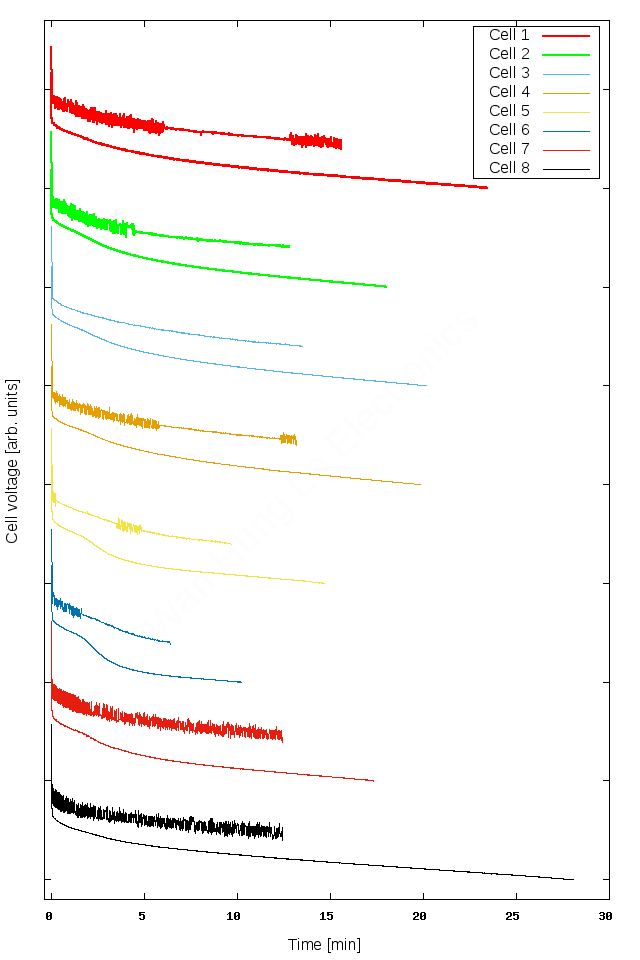 Moreover, there’s a pronounced kink visible for cell 6, and to lesser extent, for cell 5. That’s not the typical discharge curve, this has to have something to do with the ageing of the cell. As other cells do not show such behaviour, it’s highly unlikely that my test setup is the root cause for it. So the internal resistance goes up at some point above 3.4 volts…I initially thought about a thermal effect, as the batteries do get warm in the process. At the end of the discharge, all of them were around 35 to 37°C, compared to room temperature of 24°C. Thing is: Heating up a cell should lower the internal resistance, as chemistry almost always works better with elevated temperatures – hence the “+10K = double the rate of reaction” rule. So even if the cells do get hot around this 3.4V point, it cannot explain the sudden drop in internal resistance and therefore voltage.
