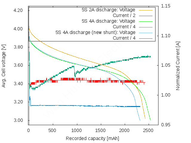 It also looks like the pack is dying cycle over cycle. First run I took was at 4A, then 2A, then the revised 4A (I’ll elaborate on that in a bit). Capacity decreases each run – 2535mAh, 2425mAh and 2315mAh respectively (the exact 110mAh steps might be a coincidence). I never made it to stop the tests before the hard 3.0V per cell cutoff that my electronic load does by default, so the weakest cell went below 3V each time. Once again – capacity gains when squeezing out the last drips are negligible, but it’s probably hurting the cells.