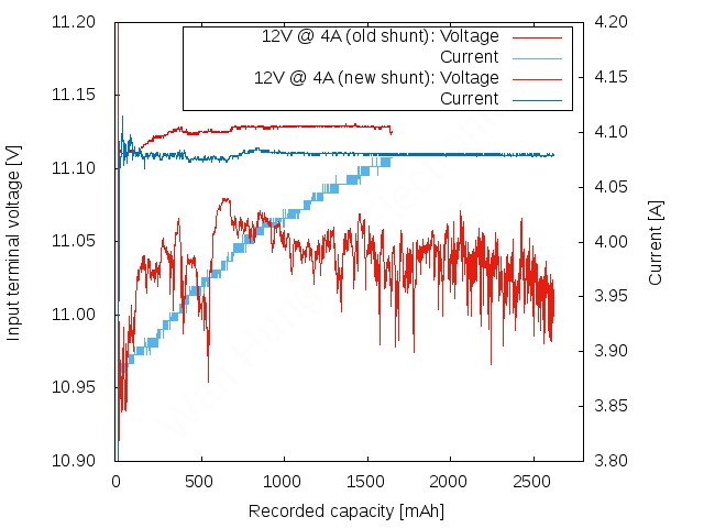 But have a closer look at the numbers: In the former test, current went up from 3.9A to almost 4.1A (5%), while voltage was regulated within less than 50mV (less than 0.5%). This time, current was stable within 20mA (0.5%), and voltage regulated between 10.95V and 11.10V – just shy of 1.5%. So overall stability increased by a factor of 3!