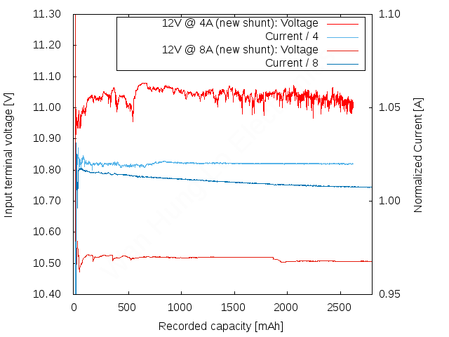 Unfortunately, this doesn’t seem to be the full story. I ran another test at 8 amps, which is shown in the graph above. I divided currents by 4 and 8 so that we can see some detail. Voltage wasn’t changed (but axis range had to be extended, due to the voltage drop in the leads). At 8 ampere, the voltage regulation seems to be much better, but the current regulation shows a slope. It’s ramping down from 8133mA to 8058mA (only short of 1% – axis range can be deceptive…). Voltage stayed within 10471mV to 10520mV, which is another 0.5% of variation. So for higher currents where contact resistance and also wire resistance plays a role, current regulation seems to become a bit less stable, but overall performance stays consistent.