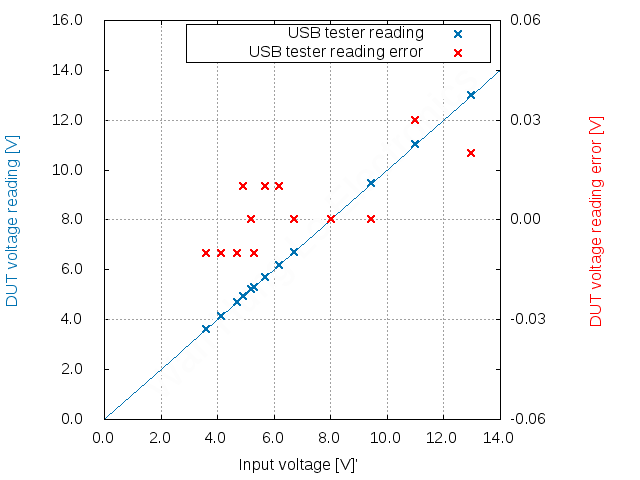 Current measurements are however a bit of a problem for me. I do not own any precision current sinks (or sources) and I need to rely on known resistors under known voltages. Voltages are okay as seen in the above image, but resistors..meh. I have the Half Ohm for precision measurements…for up to 3 Ohms. That’s a bit of a problem when I want to try values up to the maximum allowable voltage AND stay below the 3 amp rating. So I decided to use a 12Ω, 17W power resistor from Vitrohm that I have in stock for some 12V/1A measurement. It reads (12.4±0.2)Ω on bare terminals, spec is ±10% (yawn). Combine that with some short USB plug to connect to the USB tester, that’s more like 12.6ish Ω.