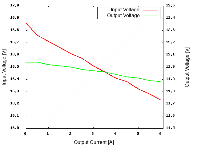 Power regulation of the input is much worse than the regulated 12V of the output, which probably is due to cable length. On the contrary, that would be the same on a laptop, meaning the voltage drops significantly when power is needed the most, making this a sub-par power supply. It’s useful for testing, but I wouldn’t use it any more on a production machine. Load regulation of the step-down however is pretty good – 12.04V in the no-load case, down to 11.88V at 6A. That’s inside the 1.5% spec. Not sure if that is still the case at 10A / full load, but that is certainly good enough for me. ATX 12V spec for comparison is 5%, meaning the 12V rail can be anywhere from 11.4V to 12.6V.