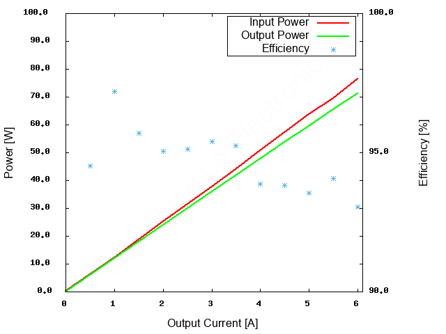 I’ve only tested this unit up to 6A = 72W out, as that’s the limit of the “19V” / 80W (yes, 80W) laptop power brick that I used. I don’t think I have much more powerful supplies with more than 12V output at hand, and I couldn’t be bothered to modify some server power supply to crank the output to 15V. If you want to help me out in that regard, please let me know